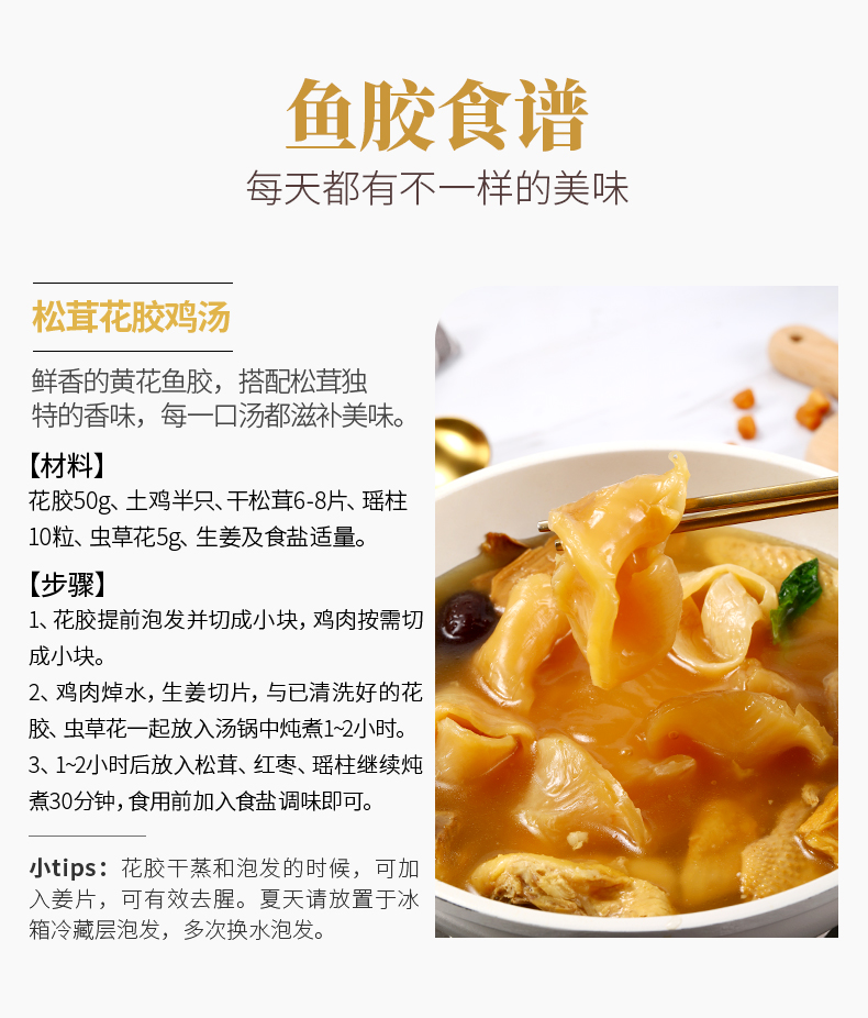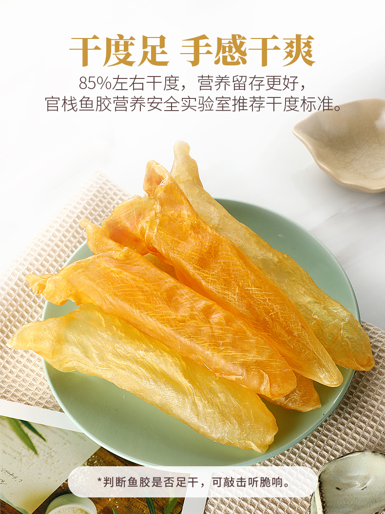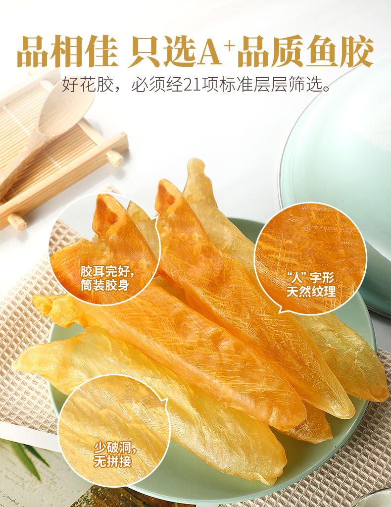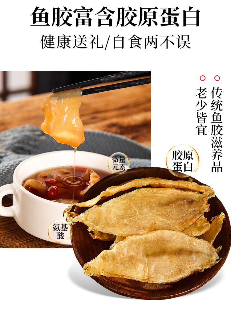 花膠即魚肚,是各類魚鰾的干制品,以富有膠質(zhì)而著名,故名為花膠?;z又名魚肚,是從魚腹中取出魚鰾,切開曬干后而成。花膠含有豐富的蛋白質(zhì)、膠質(zhì)等,食療有滋陰養(yǎng)顏、固腎培精之效,可令人迅速消除疲勞。頂級魚肚排名依次是魚膠之王:金錢鳘魚膠、白花膠、黃鱘膠、黃花膠、鳘魚膠?;z不僅是筵席名菜,還有相當(dāng)?shù)淖萄a(bǔ)價(jià)值。